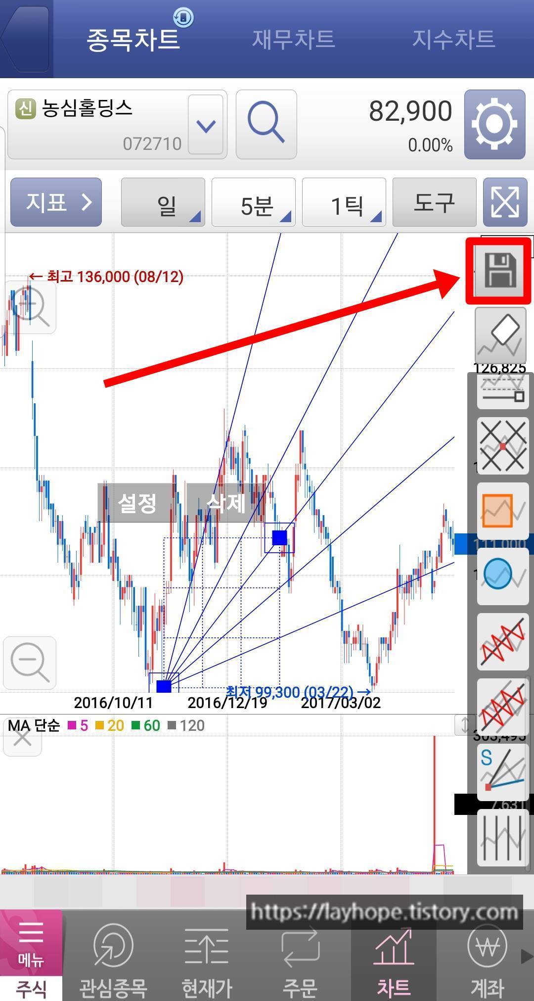 중요한 점을 한가지 말씀드리면 그려둔 추세선은 어플을 종료하면 모두 사라지게 됩니다. 그래서 항상 그려둔 차트 추세선은 저장 백업을 해두셔야 합니다. 저장 방법은 도구 상단에 있는 파일 모양의 버튼을 누른 후 저장하기를 누르시면 됩니다. 나중에 저장된 추세선을 다시 불러오는 것도 이 메뉴에서 가능합니다.