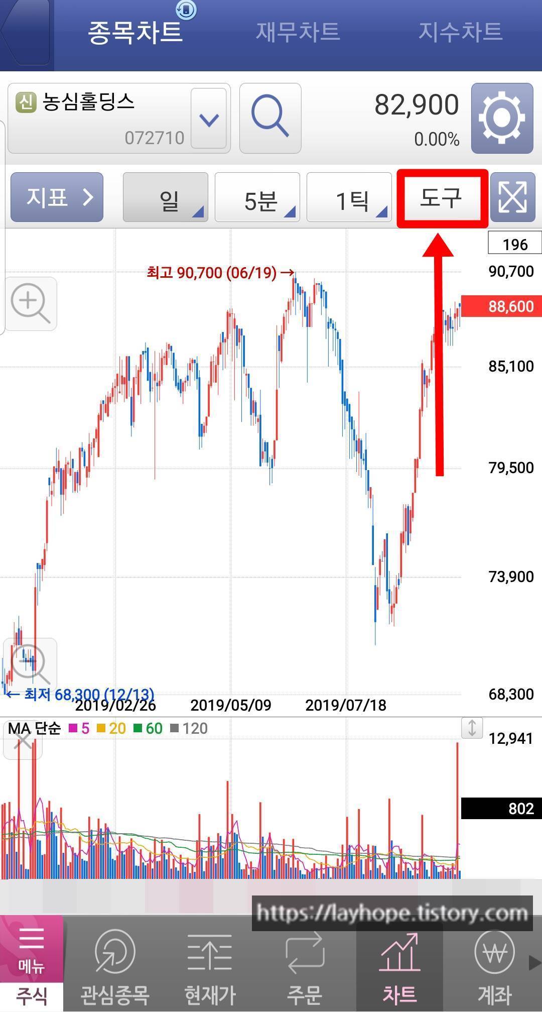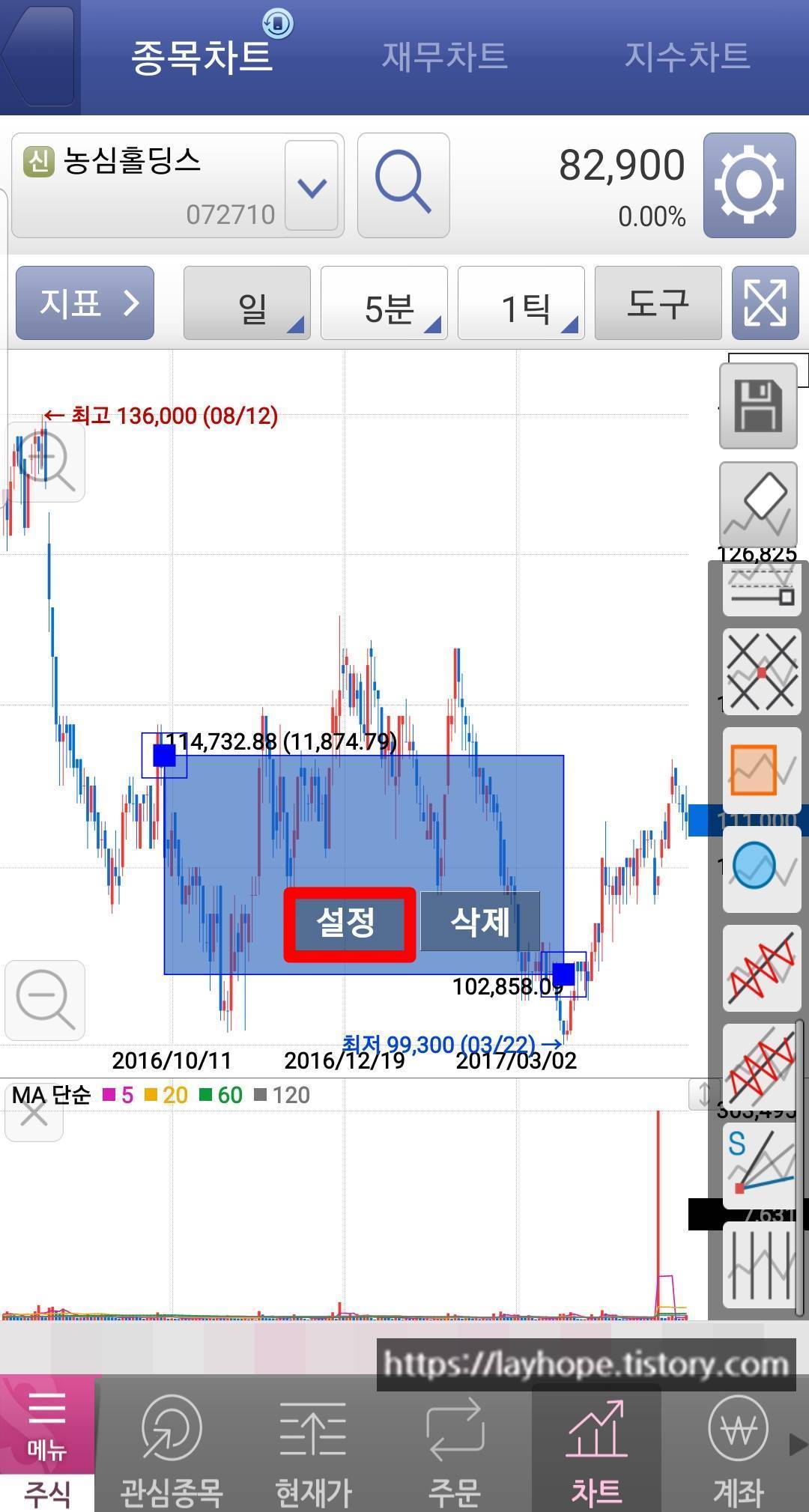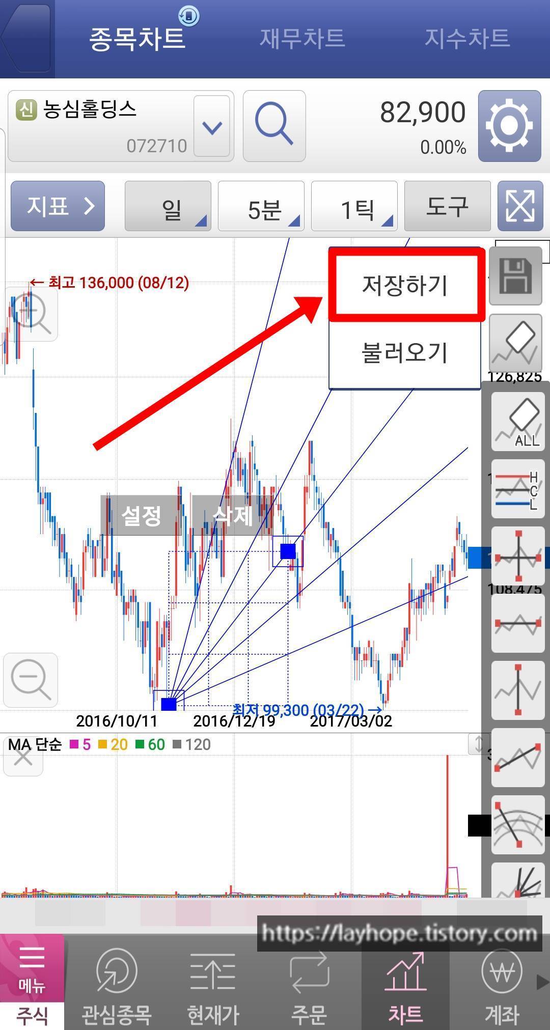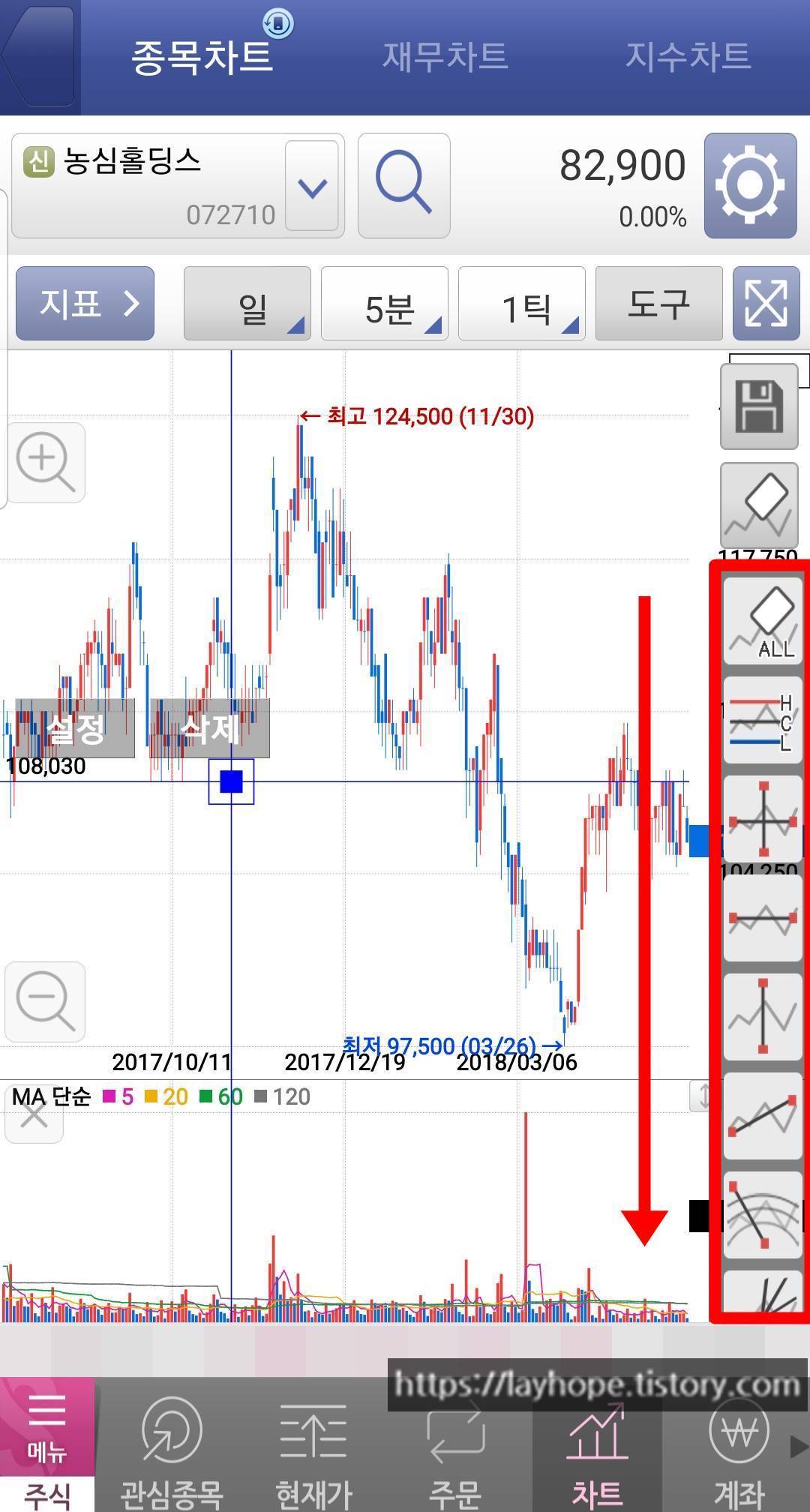 영웅문 MTS 어플에서 차트 추세선 그리기