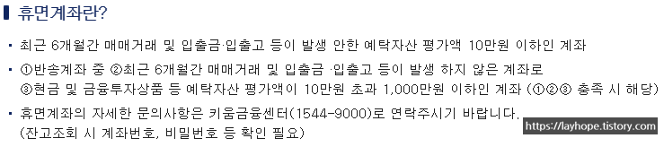 휴면계좌란? - 최근 6개월간 매매거래 및 입출금, 입출고 등이 발생 안한 예탁자산 평가액 10만원 이하인 계좌