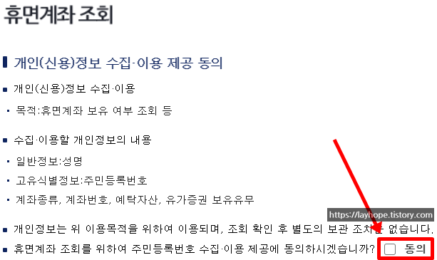 ▲ 휴면계좌 조회를 위해서 개인정보 수집, 이용 제공 동의를 해주시면 됩니다.