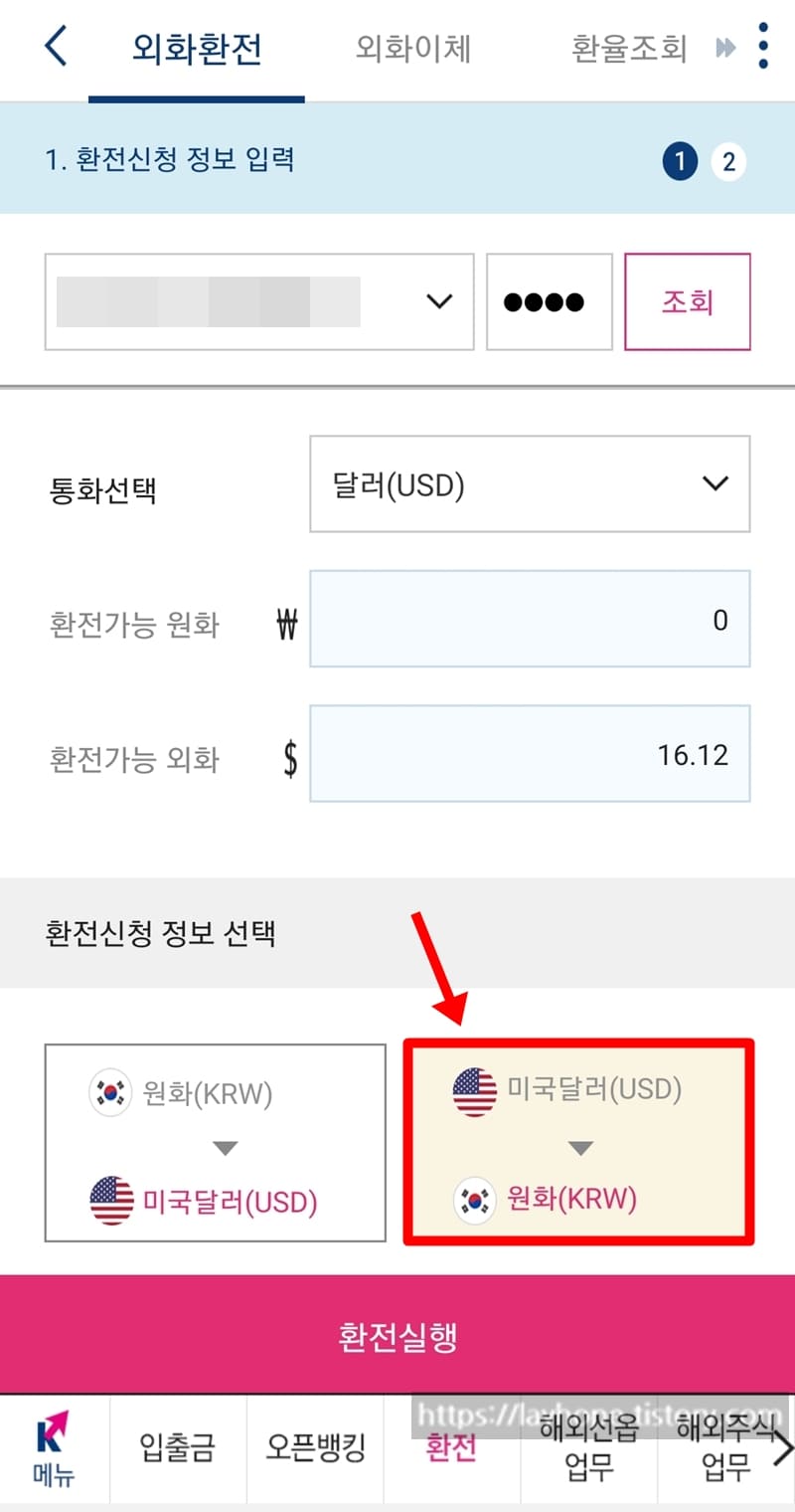6. 환전신청 정보 선택에서 미국달러(USD) ▶ 원화(KRW)를 선택합니다.